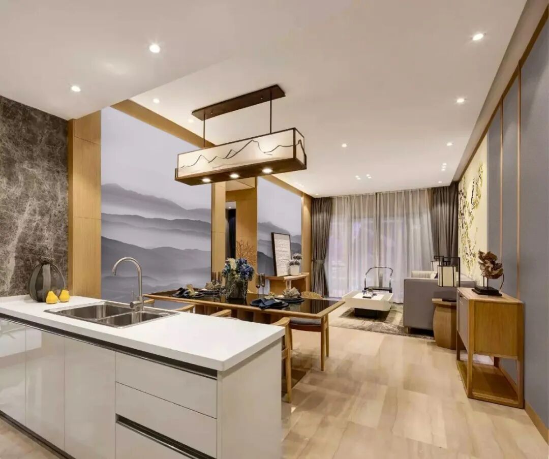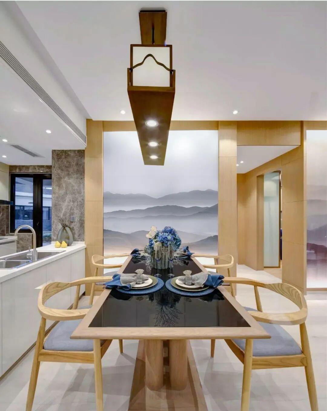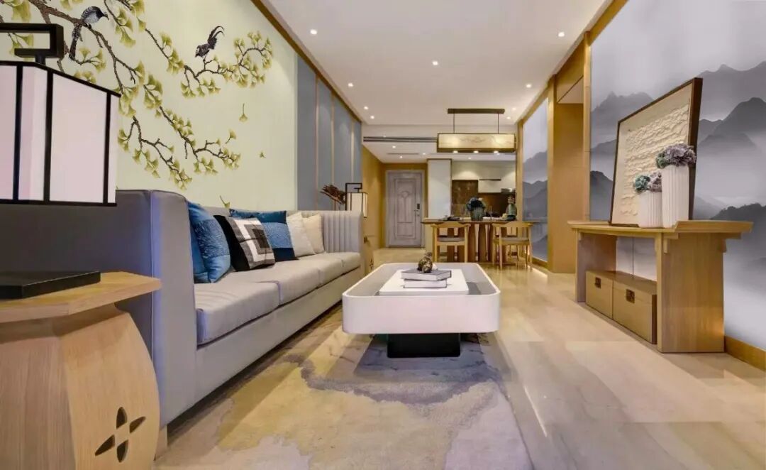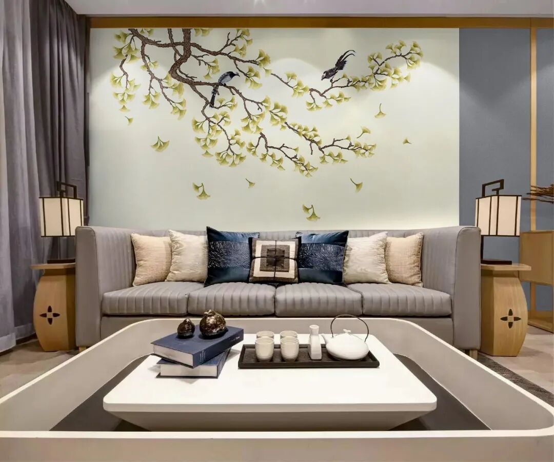 远山连绵、重峦叠嶂、山间白云、缭绕变幻,新丝路白璧的印系列中式壁画,带你走进一个和谐安逸而又富有诗意的家。整个墙面使用烟灰色墙布,简朴而真实,带给你清雅的生活意境;“杏”福树丝路独绣,多么美的银杏叶,片片都是秋的不舍,喜鹊嘻戏树间,寓意生活的幸福和美好。