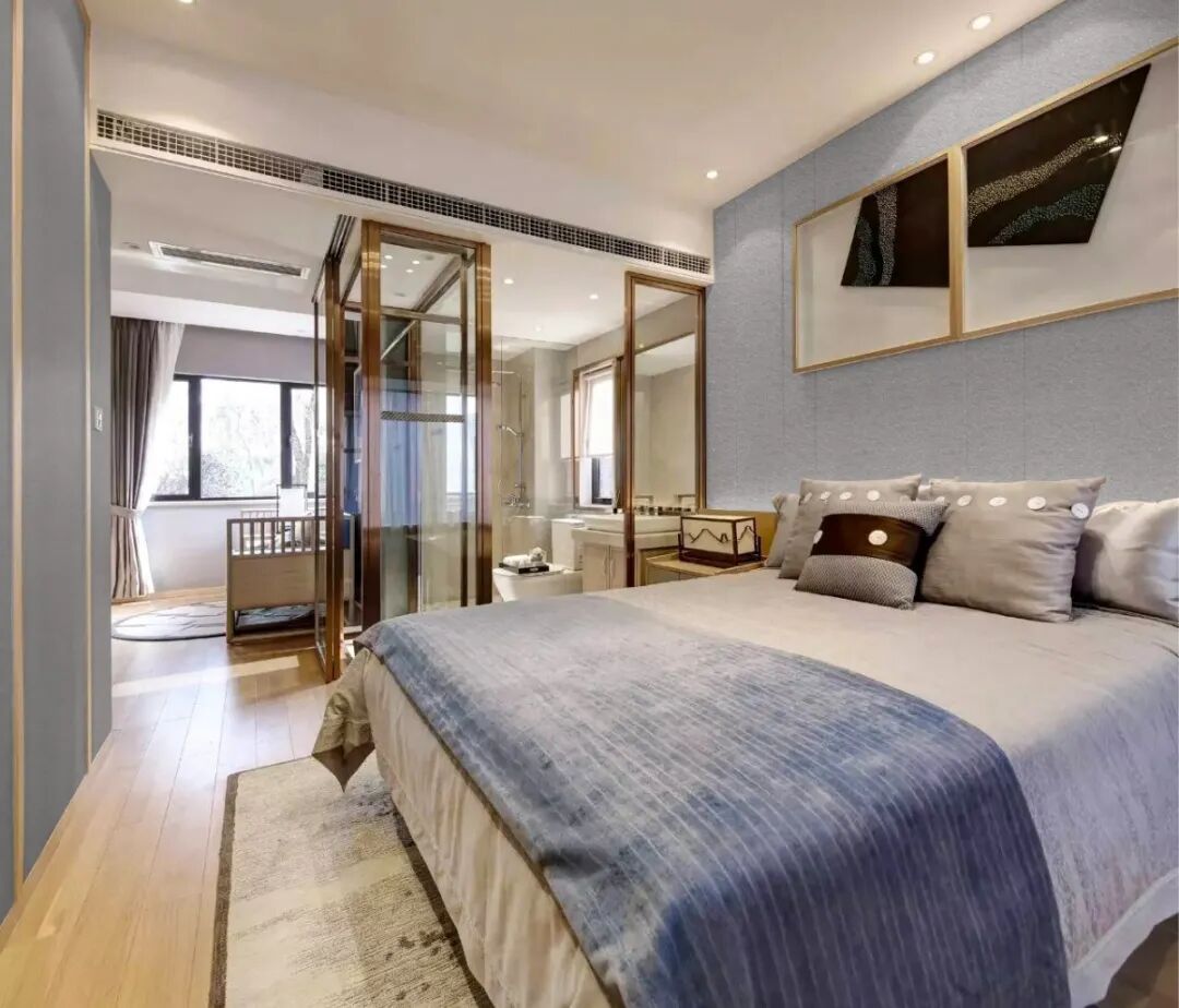 主卧床背景挂着山水墨韵壁画,墙壁上隐约浮现的光,是灰色色调下透过的亮点,凝视眺望,似晨曦微露,自然清新。