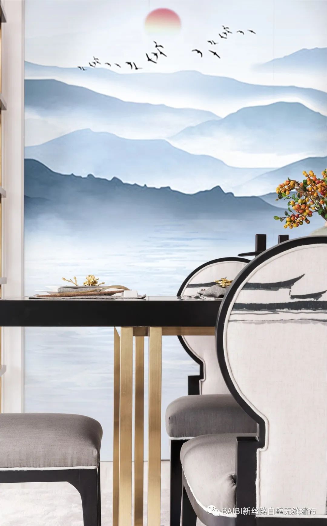 一幅有记忆、有韵味、有品质的水墨画墙布款款而来,绿浓万枝红一点,动人春色不须多。远看山有色,近听水无声,把人们带入如诗如画的意境当中。桌椅、花瓶等融入了中国文化元素,体现了主人的高阶品味。