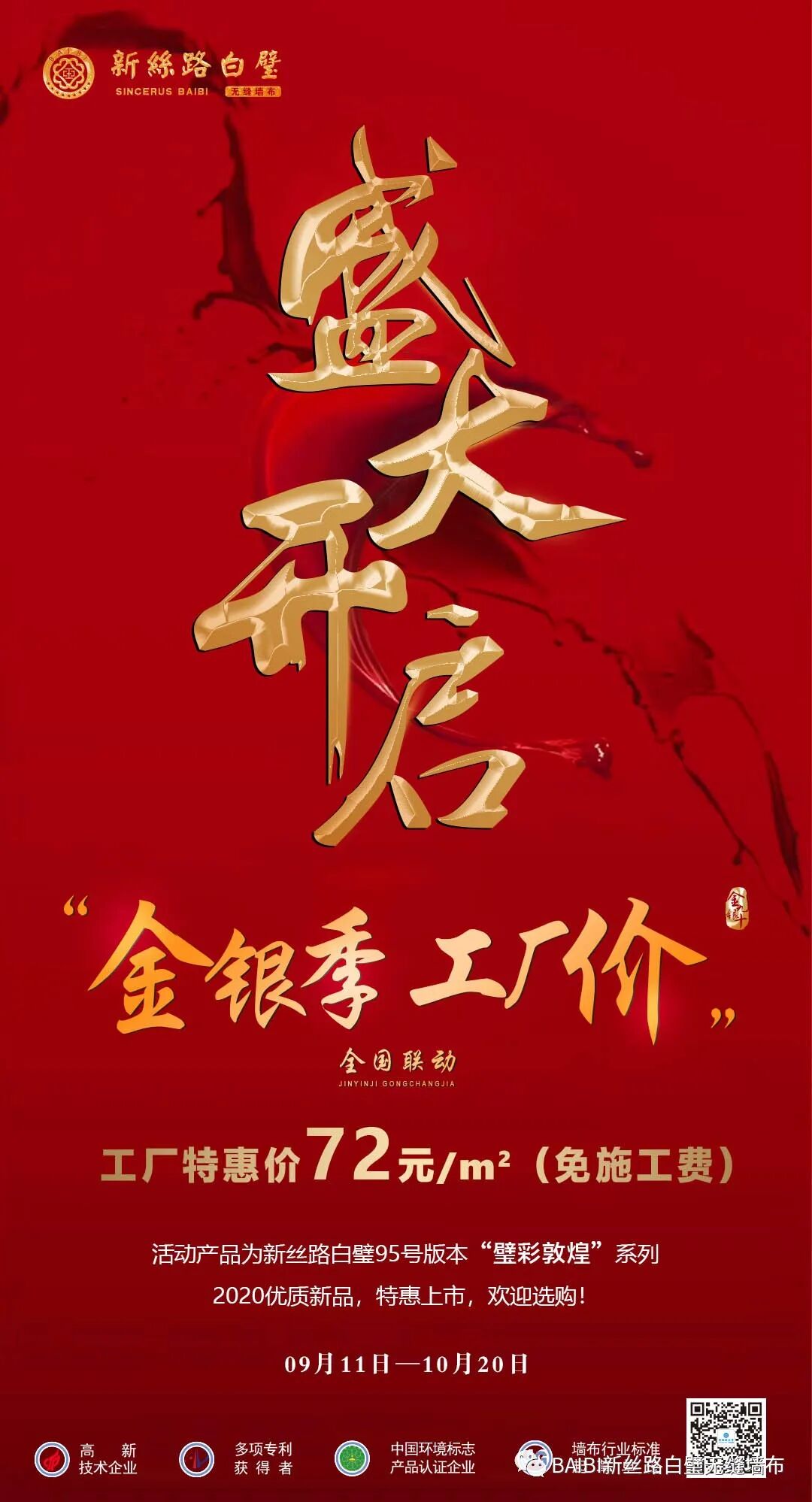 值此金九银十,装修旺季即将来临之际,新丝路白璧特别推出“金银季 工厂价”全国联动。此次活动选取了公司全新研发的95号版本,公司采用仿麻、仿毛的领先生产工艺,开发出的新品布底结实质感,纹理时尚耐看,色彩淡雅沉稳(版本中的黄釉色系、灰咖色系与敦煌壁画中的色彩交相呼应),使每块墙布透露着“精髓沉淀”的高级气质。在通往西方的“丝绸之路”上,敦煌是史籍中所称的“咽喉之地”,意义重大而深远。此次参加活动的95号版本取名为“璧彩敦煌”系列,寓意着新丝路白璧在“新丝绸之路”上,必将描绘出流光溢彩的美丽画卷。