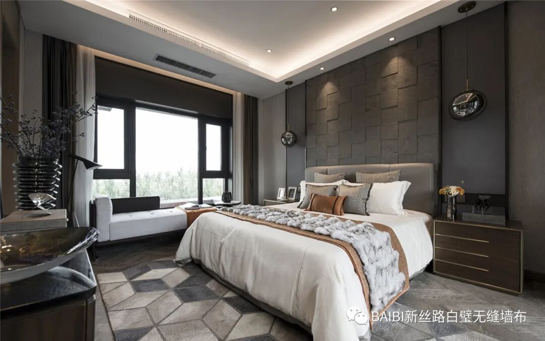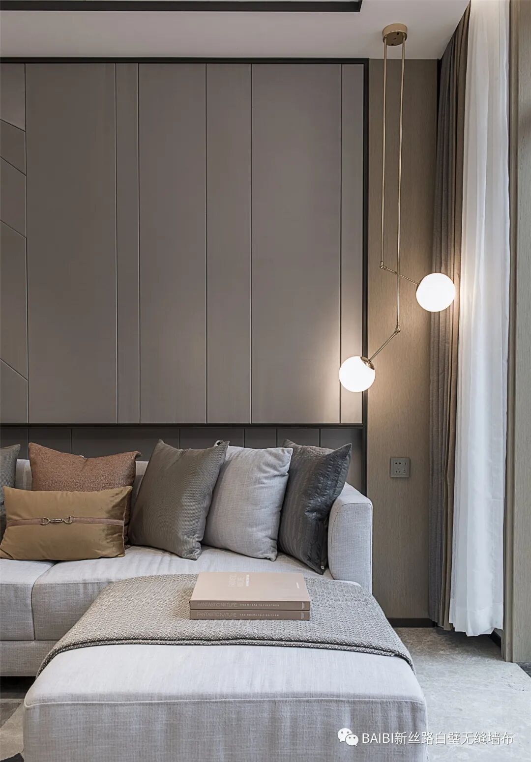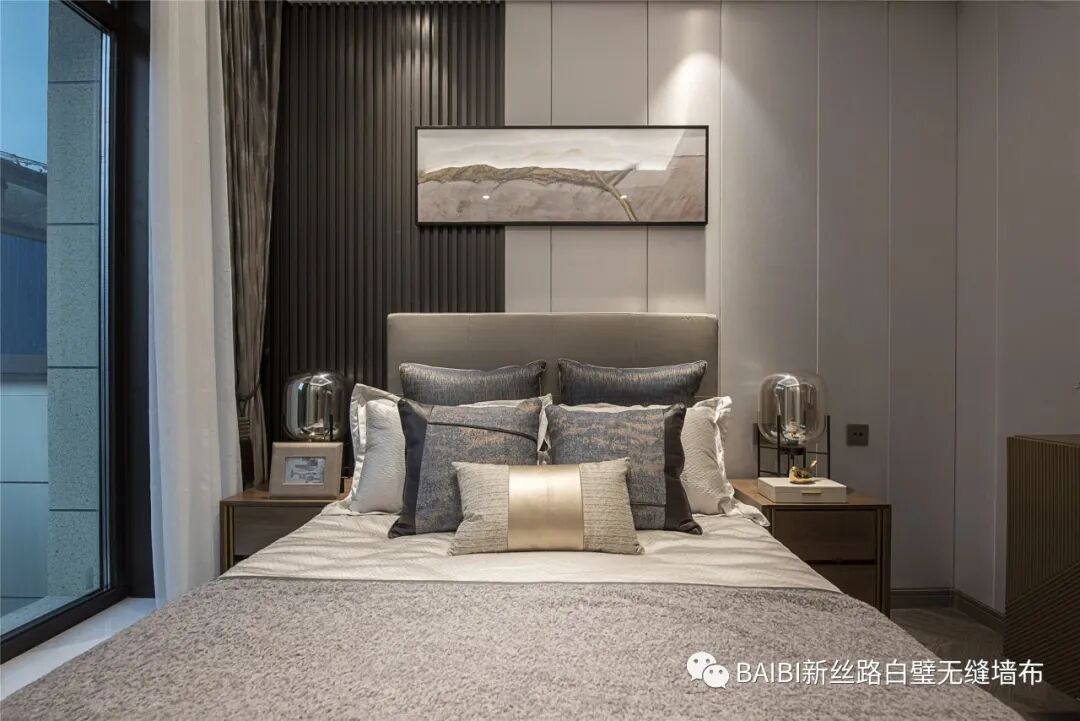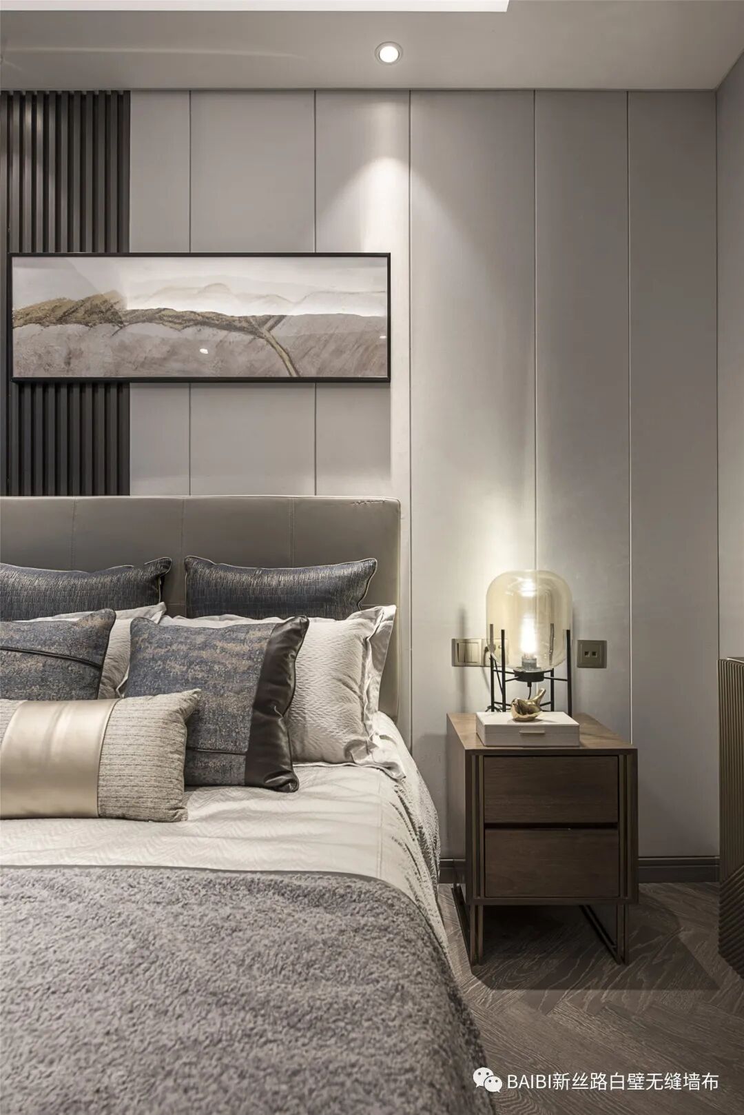 床头背景墙用的灰色大理石,与对面墙面的俏装墙布遥相呼应,白色的床品和沙发平衡了空间内敛沉静的氛围,营造出一份清爽干净的视觉感,整洁之中透露出一丝高贵感。