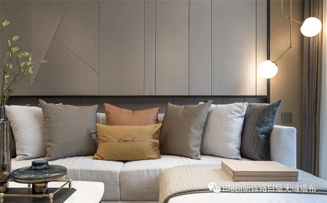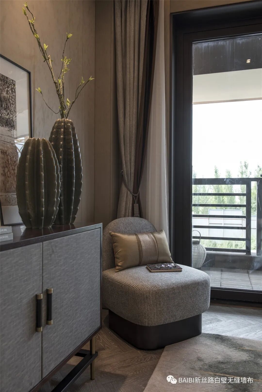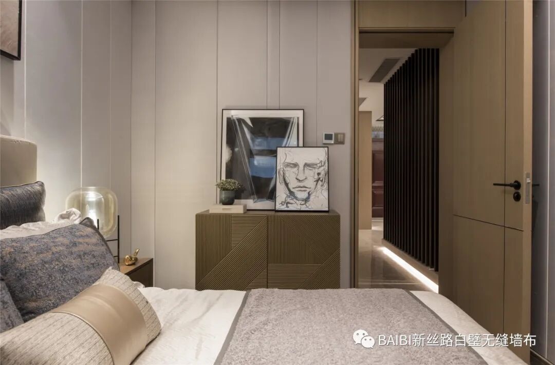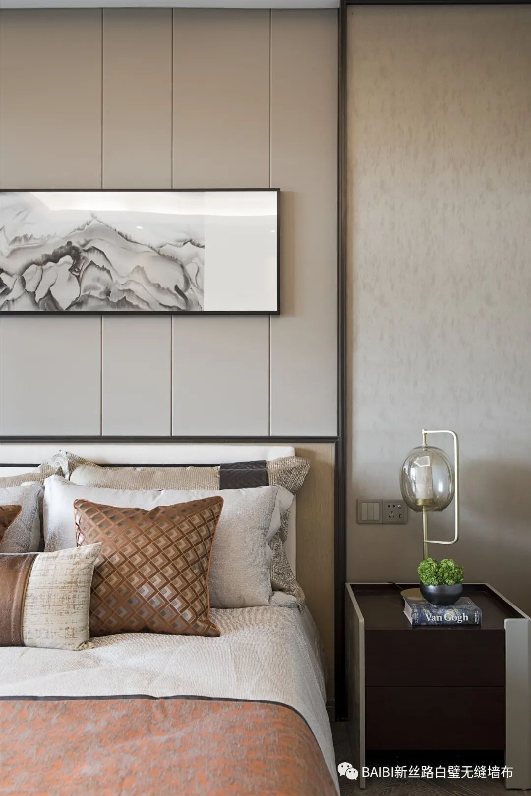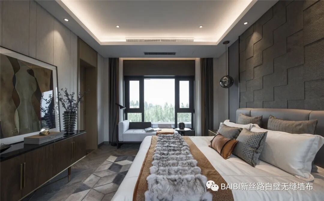 床头背景墙用的灰色大理石,与对面墙面的俏装墙布遥相呼应,白色的床品和沙发平衡了空间内敛沉静的氛围,营造出一份清爽干净的视觉感,整洁之中透露出一丝高贵感。