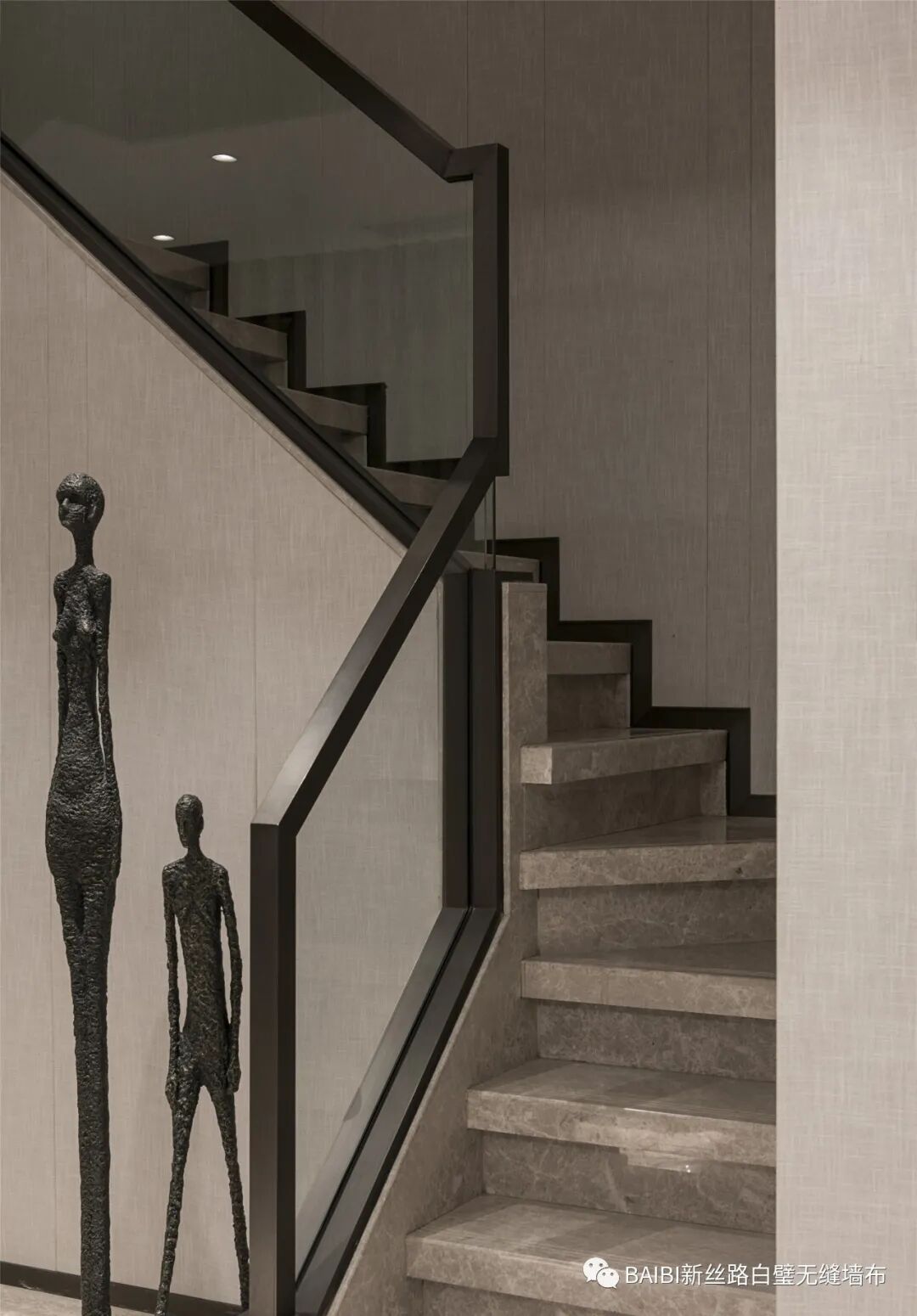 黑色扶栏的楼梯,用的也是灰色大理石地砖,俏装墙布打造楼梯墙面,专门解决了复式楼梯层高有拼缝的问题。
