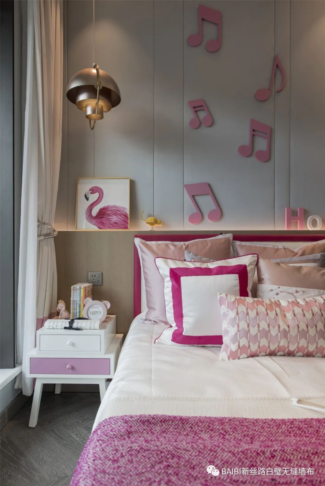 女儿房在统一灰白色系装饰风格的基础上,白色床品增加红色和粉色点缀,俏装墙布上也粘贴着粉红色的音乐音符图片,使空间顿时散发出温馨浪漫的气息。