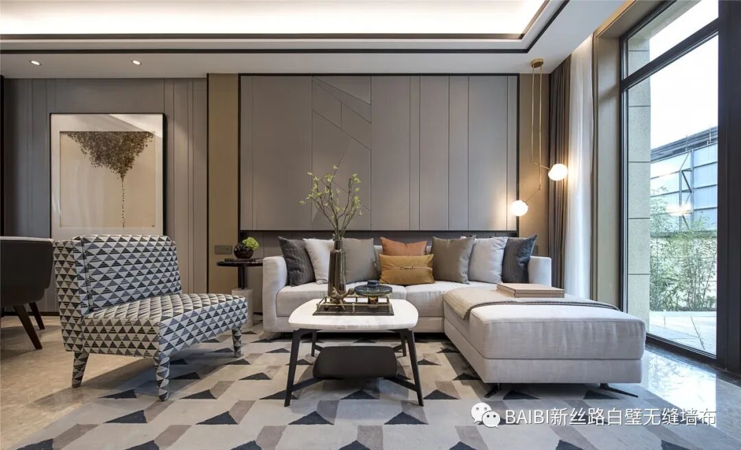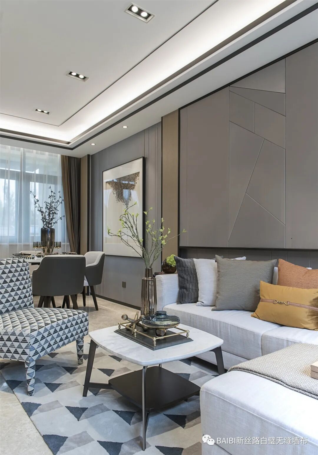 灰色的几何图形俏装墙布,精密纹理,厚重时尚,搭配浅灰白色的沙发,还巧妙地运用大理石、金属、皮质、毛绒等材质,注入到以灰白为底色的空间里作为点缀,创造出令人惊艳的吸睛效果。房间内还有一些绿色枝条用来丰富整体空间,简单不失大气,充分体现了现代客厅的空间魅力。