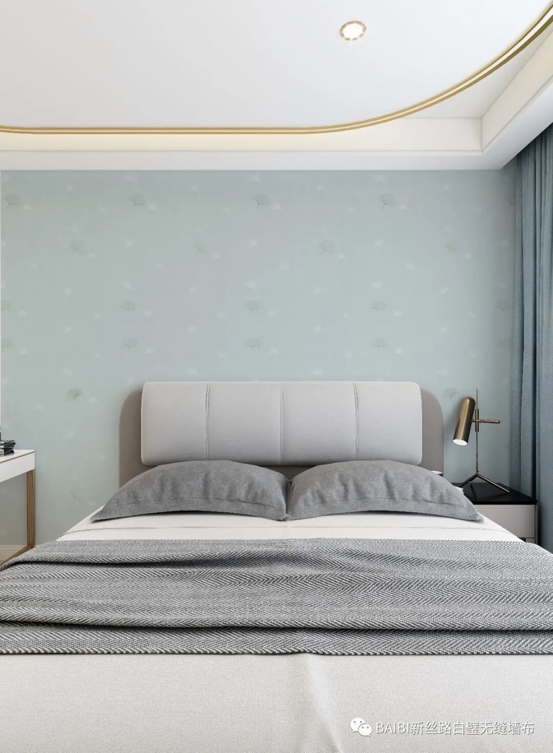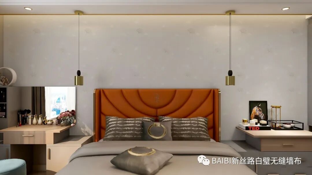 卧室床头背景也是新丝路白璧“丝路绣色”墙布,底色为浅灰色,银杏叶在灯光下若隐若现,清新淡雅。床品选用曙光银色,爱马仕橙色的床头显得格外醒目,质朴木色的床头柜,为空间带来层层暖意。