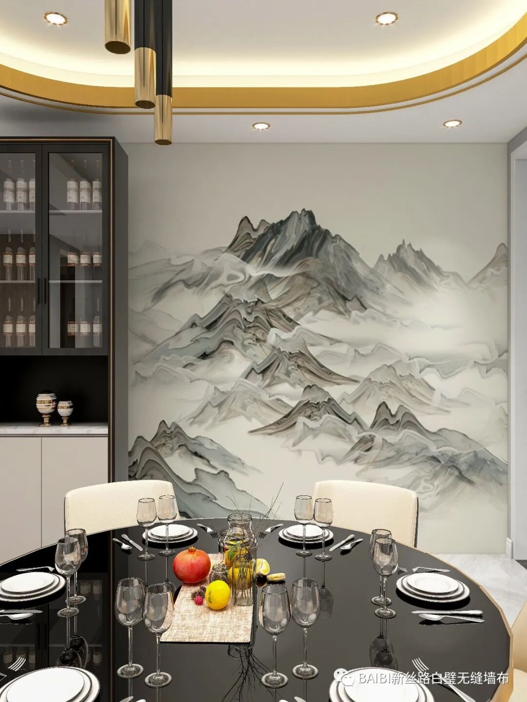 餐厅和厨房,连着客厅,巧妙地使用了黑白色,简洁、时尚、现代,亮点在于餐厅区域的主墙壁上,一幅“印”系列壁画,抽象的艺术装饰画,云雾缭绕,重峦叠嶂,浮光掠影,以及魅影黑的餐桌和酒柜,营造出高级且有意境的美好氛围。