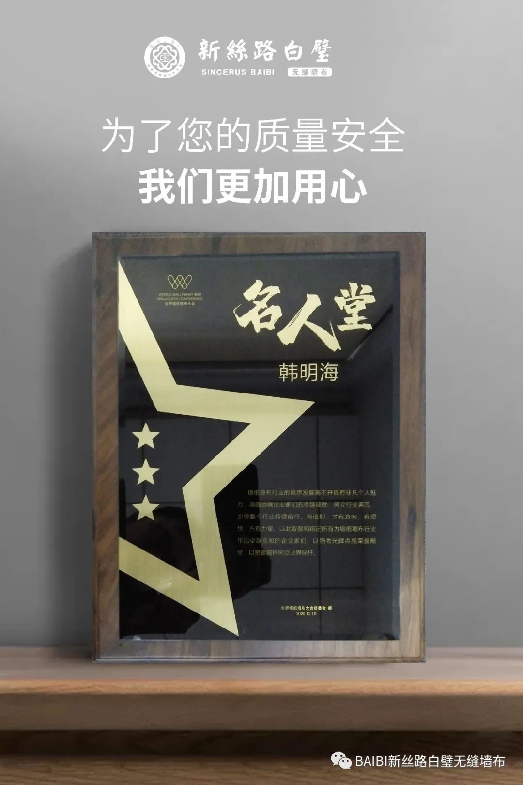 在整场大会最重量级的奖项授牌中,共有五位行业杰出贡献者荣获中国墙纸墙布行业“名人堂”的殊荣,韩明海先生作为唯一一个非协会任职人员名列其中,凭的是专心致志的“匠心”精神,精益求精的“匠人”品质,成功开创了“无缝墙布”新时代,可谓功不可没,实至名归!