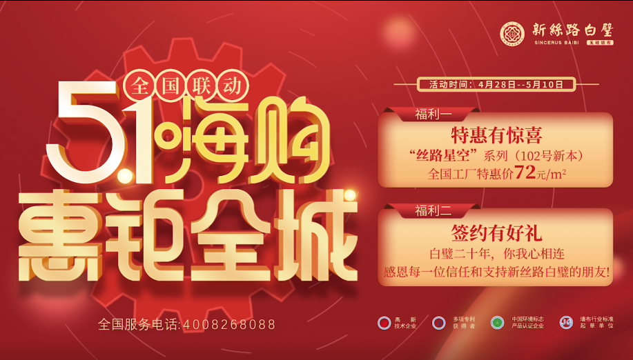 51嗨购,惠钜全城!4月28日至5月10日,新丝路白璧“丝路星空”系列工厂特惠价每平米72元,优质优价,敬请抢购!!!