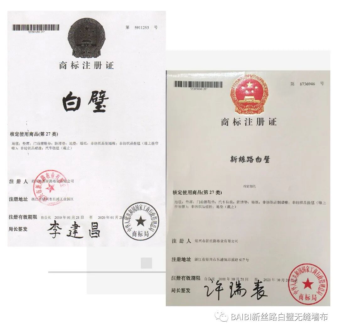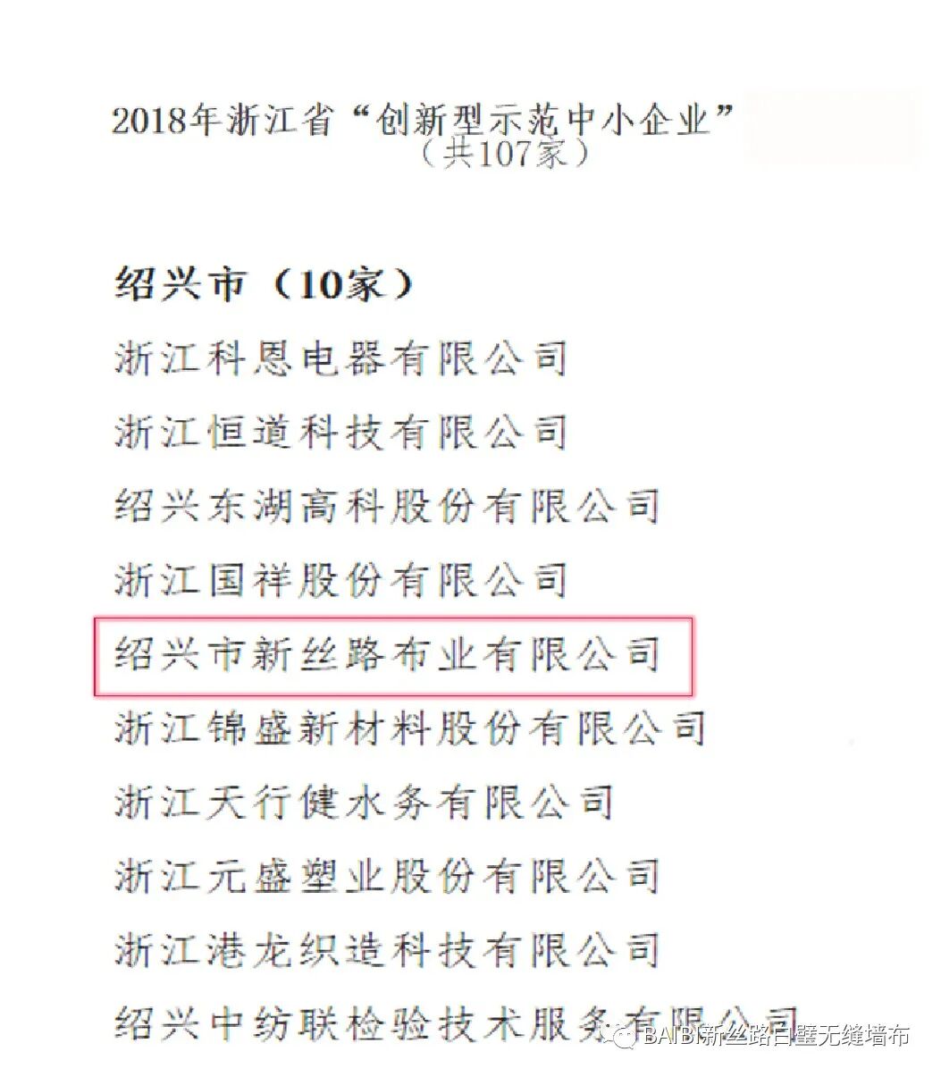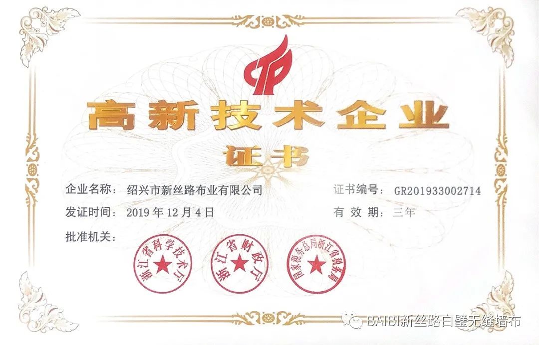 同时我们对研究的知识产权成果进行了申请保护,先后申报了“新丝路白璧”和“白璧”牌产品24类、27类商标申请和白璧牌图案商标在意大利的商标申请,分别于2011年10月21日、2010年2月14日、2010年9月16日获得了相应知识产权的授权和保护。我们的创新收获成果,我们的创新取得认可。2016年11月,绍兴市新丝路布业有限公司被授予国家高新技术企业,2018年,企业被授予浙江省“创新型示范中小企业”。