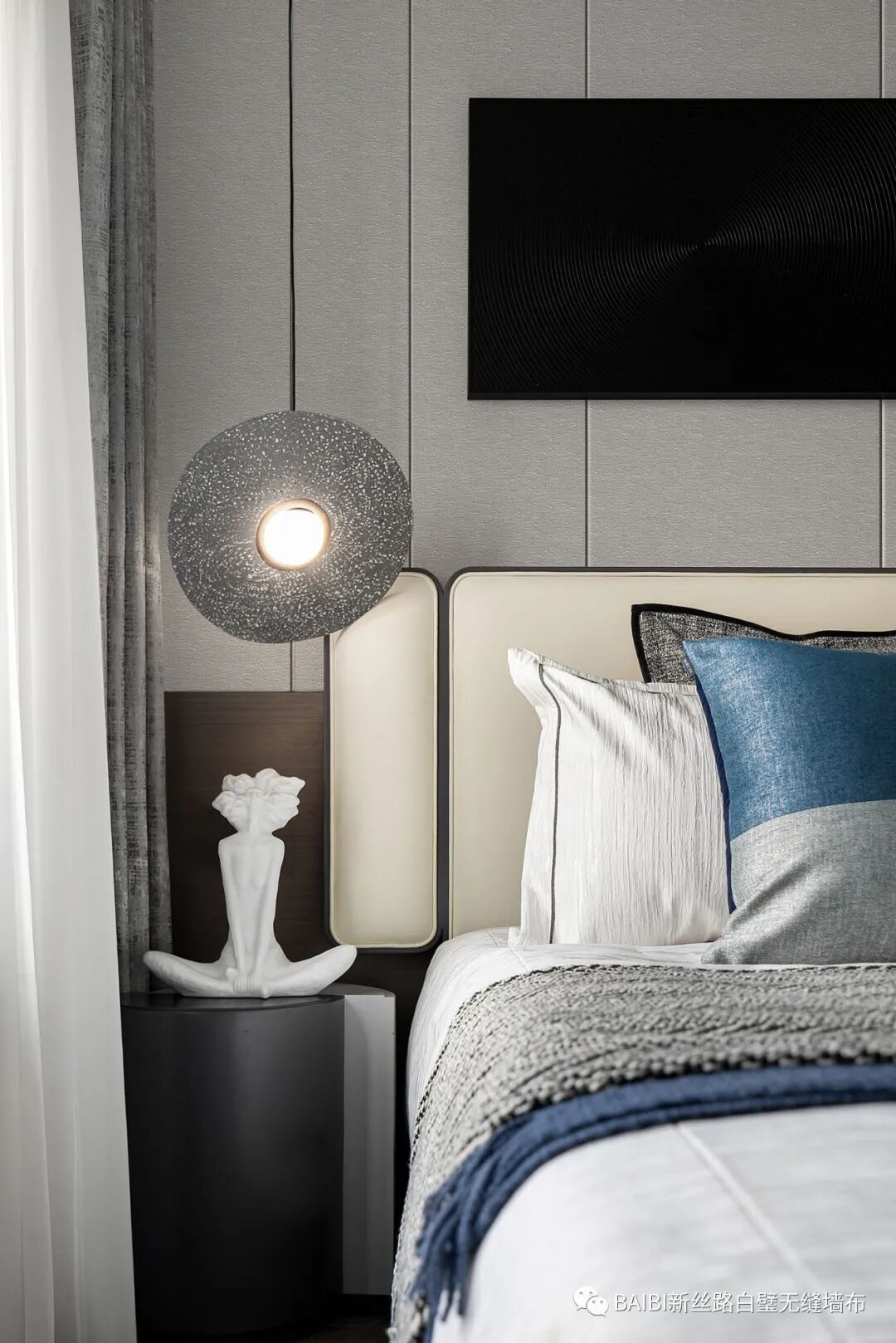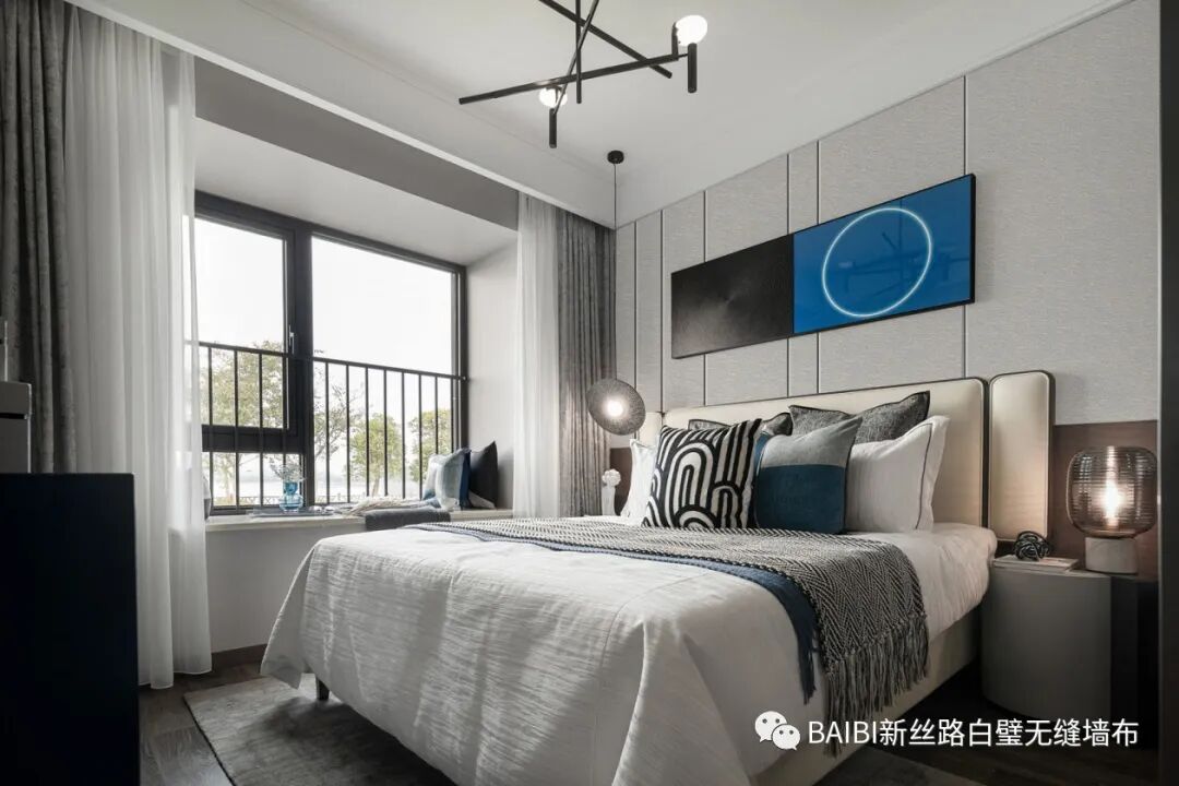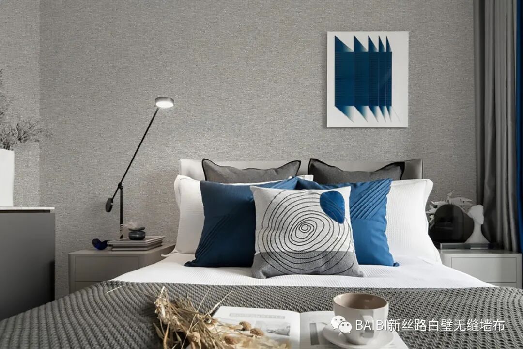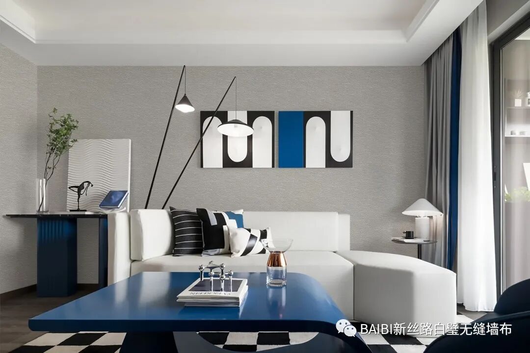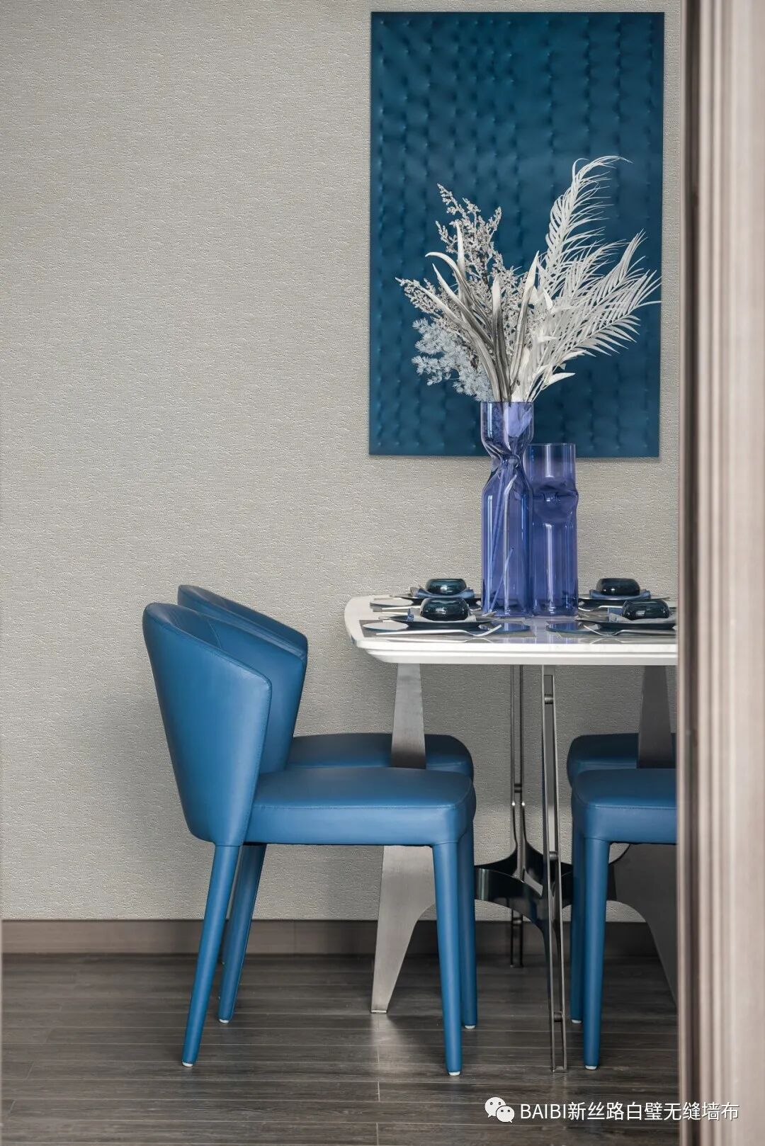 合理的空间布局和蓝灰白搭配,追溯活力清新之源。素色浅灰、纹理细腻的新丝路白璧墙布,经典耐看,时尚个性,清新高雅。