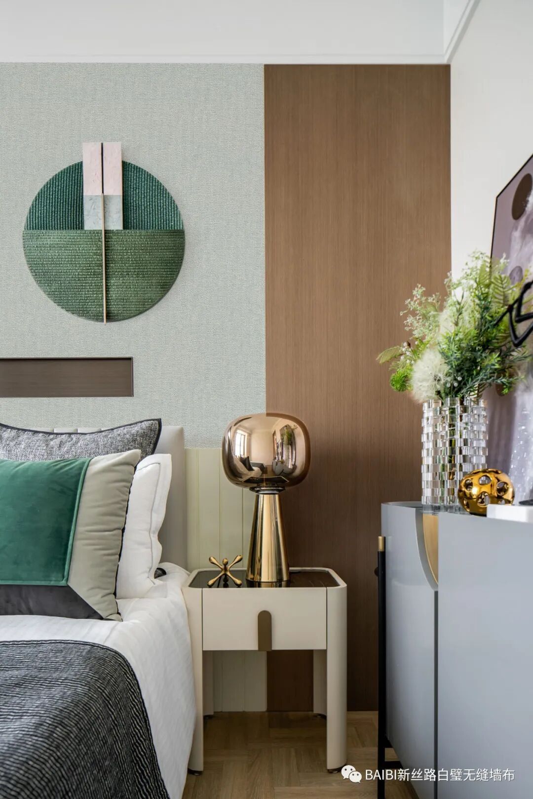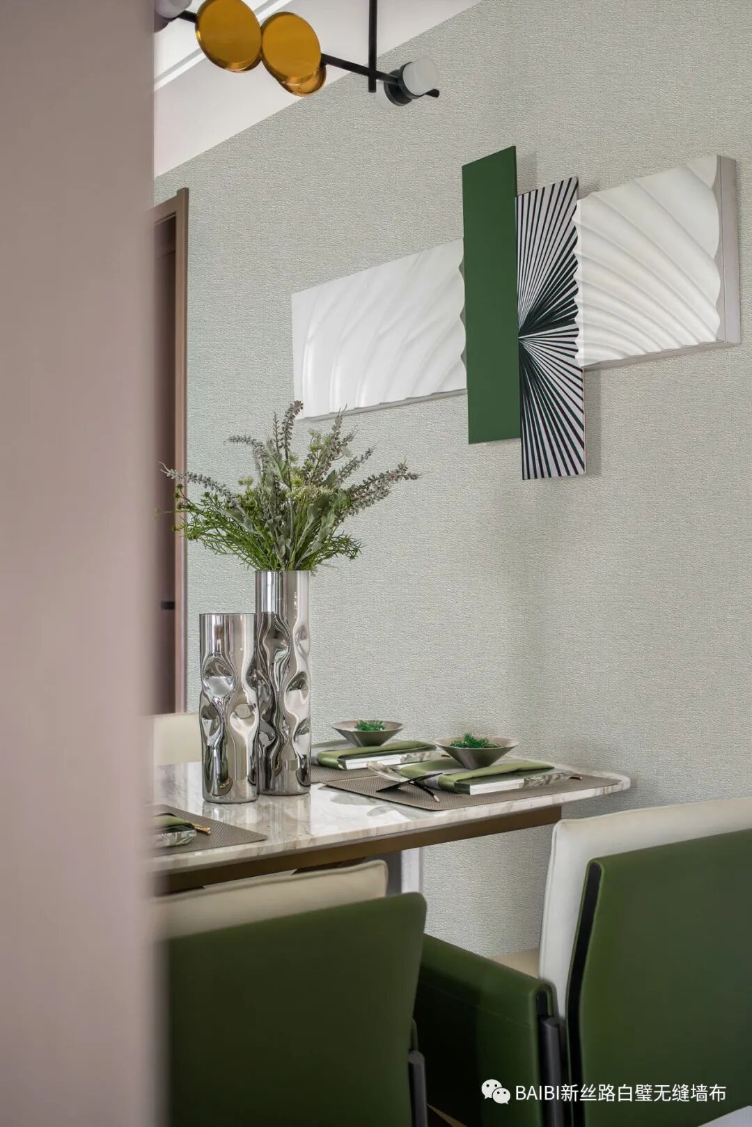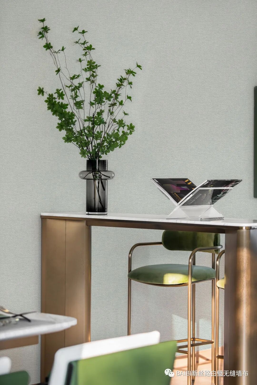 整个空间的配色充满生机又给人以大气的感觉,以清亮淡绿、高精细密的新丝路白璧墙布作为墙面的主色,奠定了一个自然优雅的格调。